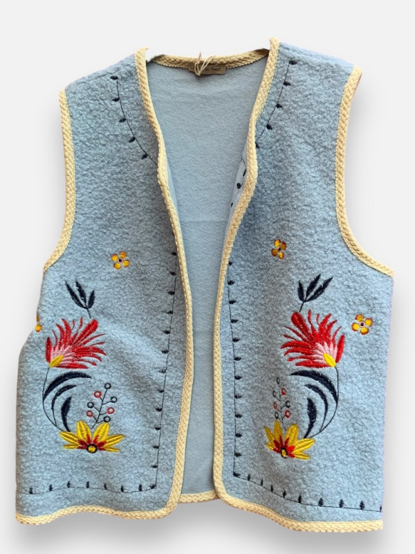Succombez au gilet Sabine, une merveille de douceur et de style ! Confectionné en laine bouillie de haute qualité, ce gilet sans manches est entièrement brodé et tissé avec des motifs floraux délicats. Son coloris bleu ciel est un véritable enchantement, rehaussé par un biais beige qui souligne avec élégance les contours et les emmanchures. C'est la pièce parfaite pour structurer une tenue tout en restant au chaud. Comme il ne possède pas de fermeture, il offre un tombé très fluide et naturel qui convient parfaitement jusqu'à la taille 42. Portez-le sur une chemise blanche ou un petit pull fin pour un look sophistiqué. Les détails de broderie jaune, rouge et bleue apportent une gaieté incroyable à l'ensemble. C'est un vêtement 'coup de cœur' qui témoigne d'un véritable goût pour les belles matières et les détails soignés.