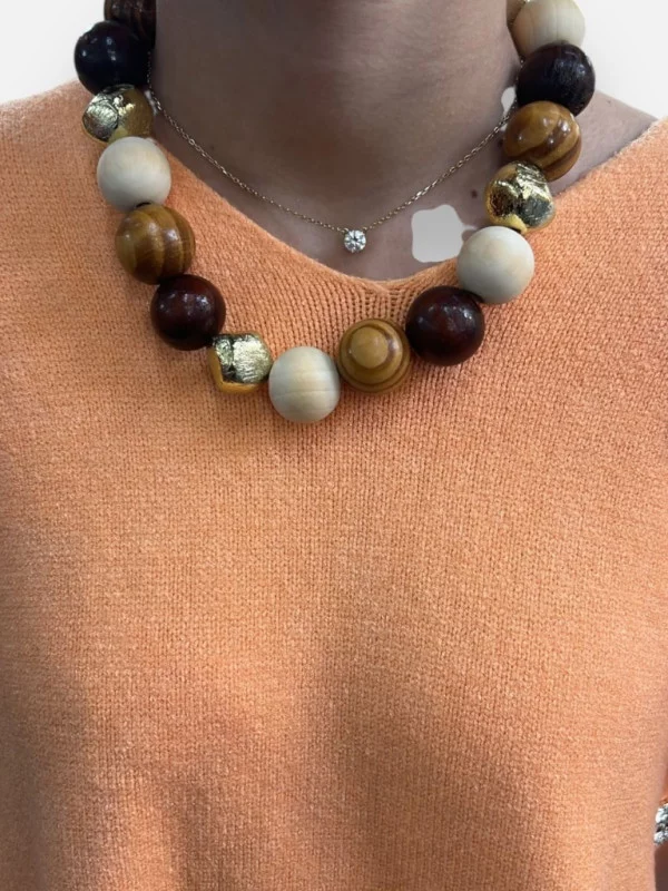 Le Collier Bois est l'accessoire idéal pour celles qui aiment les matières organiques et les bijoux qui ont du sens. Inspiré par le design d'un boulier, il alterne des perles de bois de différentes tailles avec des touches dorées qui apportent une luminosité bienvenue. Sa principale qualité est sa légèreté absolue : vous oublierez presque que vous le portez, malgré sa présence visuelle forte. Il s'intègre parfaitement dans un look bohème, sur une robe longue en lin ou une tunique fluide. Le mélange des tons boisés naturels et du brillant crée un équilibre parfait entre rusticité et raffinement. Un accessoire authentique, facile à ajuster en longueur, qui souligne votre connexion avec la nature tout en restant résolument chic pour la vie de tous les jours.