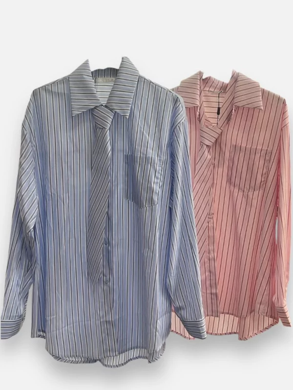 La chemise 'Cravate' est la grande tendance du moment, mixant avec brio les codes du vestiaire masculin et la douceur féminine. Cette chemise à fines rayures est accompagnée de sa cravate amovible réalisée dans le même tissu, vous offrant une multitude de possibilités de porter : nouée strictement au col, lâche comme un foulard, ou même glissée dans les cheveux ! Sa matière en viscose mélangée est un pur bonheur sur la peau, offrant fluidité et une brillance satinée très élégante. Disponible en bleu ciel ou en rose, elle présente une coupe droite avec des pinces dans le dos pour structurer la silhouette et une poche poitrine pratique. Elle convient parfaitement jusqu'à la taille 44. Que vous la portiez avec un pantalon chino pour un look de bureau sophistiqué ou déboutonnée sur un jean pour un style plus décontracté, elle assure une allure chic et originale. C'est l'investissement mode intelligent par excellence.