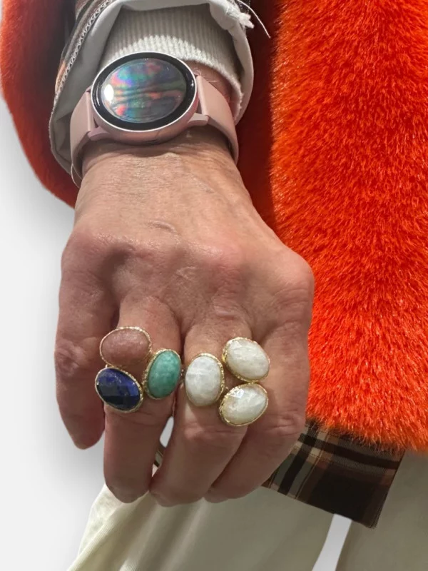 La bague Trio Pierre est un bijou plein de charme composé de trois petites pierres naturelles montées sur un anneau en acier inoxydable. Elle est disponible en plusieurs variantes : multi-couleurs, turquoise, blanc nacré ou marine. Chaque pierre apporte sa propre vibration et sa propre nuance. C'est une bague réglable qui s'adapte à tous vos doigts, ce qui est super pratique pour changer de look selon vos envies. On adore l'accumulation de ces petites pierres qui font un effet bijou de créateur. Elle est à seulement 25 euros, ce qui permet de se faire plaisir avec un produit de qualité. C'est la bague discrète mais qui se remarque par son élégance naturelle et ses jolies couleurs. Un must-have de notre collection bijoux cette saison !