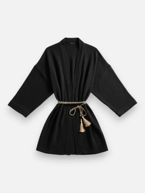Mes chères copines, le Kimono Sogno est une merveille en gaze de coton 100% naturel. Sa matière est d'une légèreté incroyable, parfaite pour couvrir vos épaules lors des soirées d'été. Ce modèle noir ultra chic est vendu avec une magnifique cordelette terminée par des pompons, que vous pouvez utiliser pour le ceinturer ou même porter en collier original comme je vous l'ai montré pendant le live. Il convient à toutes les tailles, du 36 au 48, grâce à sa coupe fluide et aérienne. Portez-le sur un maillot de bain, un short en jean ou même une robe de soirée pour apporter ce côté bohème raffiné. C'est une pièce exclusive de la ligne Monadée.