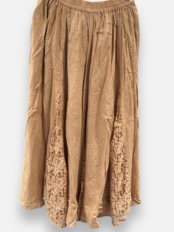 La jupe Naoli est une ode à la féminité bohème. Confectionnée en 100% coton dans un coloris camel naturel, elle impressionne par son volume et sa richesse de détails. Elle présente un savant mélange de pans de tissus, de broderies anglaises et d'inserts en dentelle, le tout entièrement doublé pour une opacité parfaite. Sa coupe 'boule' généreuse offre un mouvement magnifique à chaque pas (effet tournant garanti !). Grâce à sa taille élastiquée très souple, elle habille confortablement toutes les femmes du 36 au 50. Pour les plus petites, elle peut se porter haute sur la taille, tandis que les plus grandes la porteront sur les hanches. C'est la jupe idéale pour un look Ibiza chic, associée à une ceinture en cuir et des sandales compensées. Une pièce intemporelle, douce et spectaculaire qui sublime toutes les morphologies.