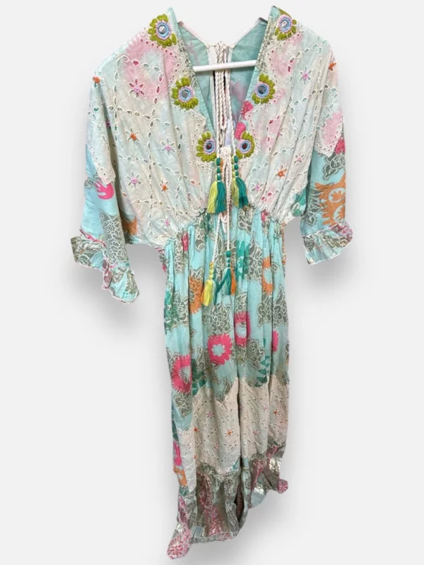 La robe Alex est un véritable bijou de textile. Cette robe courte se distingue par son travail de broderie exceptionnel intégrant des fils dorés et de véritables petits miroirs qui scintillent à la moindre lumière. Son décolleté ajustable par un cordon permet de l'adapter à toutes les poitrines du 34 au 42 (voire petit 44). On aime ses manches évasées en volants qui apportent une légèreté aérienne et un côté festif. Sa base écrue est magnifiée par les motifs de feuilles dorées qui courent sur tout le tissu. C'est la robe idéale pour une cérémonie, un mariage ou une soirée d'été chic. Elle allie confort et spectaculaire, vous assurant d'être la plus belle. Une pièce rare, travaillée avec une finesse remarquable, qui ne passera pas inaperçue. Accessoirisez-la avec des sandales dorées pour un total look éblouissant.