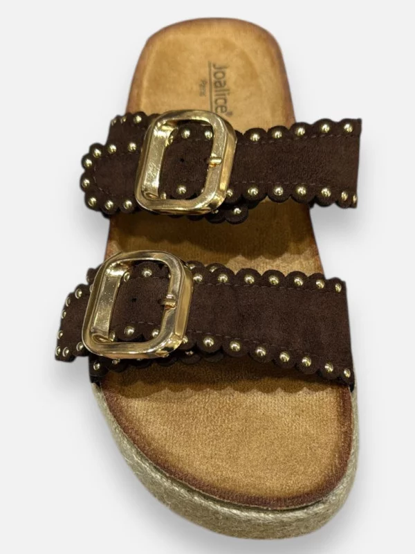 Les mules Mila sont un véritable concentré de style. Avec leur couleur chocolat profonde et leurs finitions cloutées, elles apportent une touche rock à toutes vos tenues bohèmes. La plateforme de 2 cm offre juste ce qu'il faut de hauteur pour élancer la silhouette tout en gardant une cambrure naturelle et confortable. La semelle est travaillée pour épouser la voûte plantaire, vous permettant de gambader toute la journée. Elles sont idéales avec une robe longue vaporeuse ou un jean boyfriend retroussé. Robustes et stylées, les Mila sont les chaussures parfaites pour celles qui ne veulent pas choisir entre confort et caractère. Un must-have de saison.