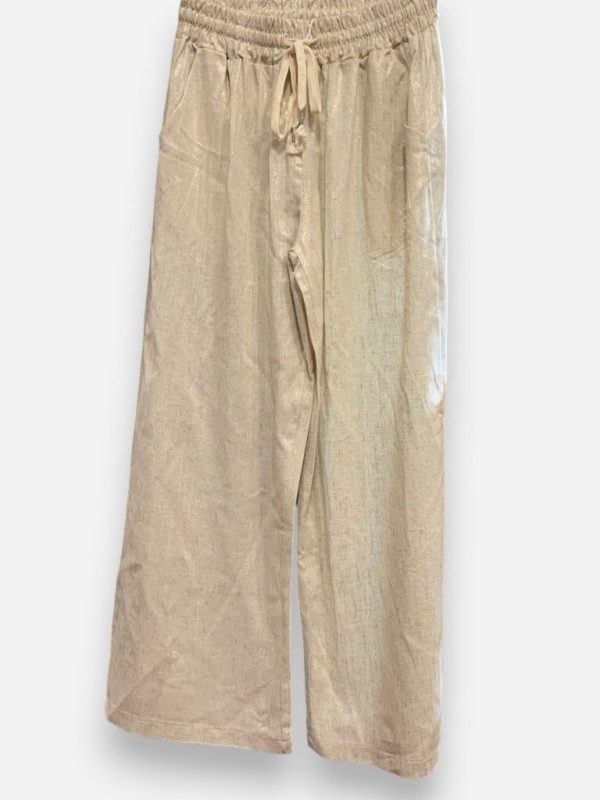 Le pantalon Bertille est la pièce maîtresse indispensable pour vos événements printaniers ou vos cérémonies estivales. Sa matière noble, un mélange de lin et de coton, assure un confort thermique optimal tout en offrant un tombé fluide absolument impeccable. On adore son coloris ivoire naturel rehaussé d'un délicat fil doré qui capte la lumière à chaque mouvement pour un effet 'glowy' sophistiqué. La taille est entièrement élastiquée et dotée d'un cordon de serrage pratique, lui permettant de s'ajuster parfaitement du 34 au 42. Pour un look ultra-chic, portez-le en total look avec une chemise vaporeuse assortie, ou cassez son côté habillé avec des baskets et un gilet en crochet pour une allure bohème-chic très tendance. Ses deux poches latérales ajoutent la touche de décontraction nécessaire au quotidien.