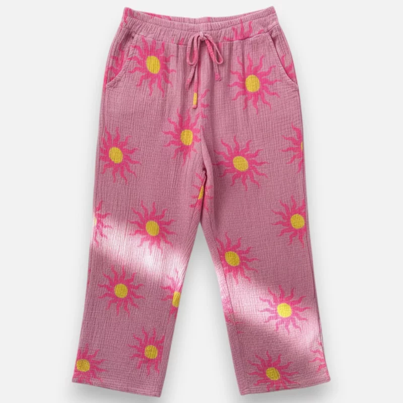 Le pantalon Soleil porte merveilleusement bien son nom ! Avec son imprimé floral vibrant disponible en jaune ou en rose sur fond de gaz de coton, il illumine immédiatement votre journée. C'est une matière naturelle, respirante et ultra douce sur la peau. Il possède une taille élastiquée et une coupe fluide qui va jusqu'à la taille 42. C'est la pièce forte de votre dressing d'été : associez-le avec un petit t-shirt blanc tout simple et le tour est joué ! On adore son côté décontracté mais stylé, parfait pour flâner en vacances ou pour une sortie ensoleillée en ville. Une dose de bonne humeur à porter sur soi.