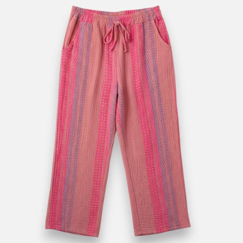 Le pantalon Zic est l'option la plus originale de notre gamme en gaz de coton. Sur un fond rose poudré délicat, on retrouve des touches de rose fluo et de parme sur les jambes, ce qui lui donne un look unique et peps. Sa matière 100% coton est un bonheur de légèreté. Il va jusqu'à la taille 42 et s'ajuste parfaitement grâce à sa taille élastique. Christelle l'a présenté avec un t-shirt rose fluo pour un rappel de couleur audacieux et réussi. C'est le pantalon idéal pour celles qui aiment la douceur de la gaz de coton mais qui veulent une petite touche d'originalité en plus. Confort et style garantis !