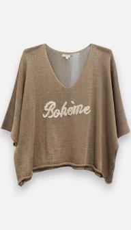 Le pull Bohème est une petite merveille de douceur. Tricoté en 100% coton, il offre un toucher naturel et un confort thermique idéal pour la saison. Son inscription 'Bohème' en jaune sur fond bleu marine lui donne un style affirmé et tendance. Sa coupe est volontairement un peu courte, ce qui en fait le compagnon idéal pour vos jeans taille haute ou vos jupes plissées. Il présente un léger jeu de transparence dans sa maille, ce qui lui confère une légèreté bienvenue. Jusqu'au 44, il s'adapte à votre silhouette avec une aisance remarquable. C'est la pièce parfaite pour créer des superpositions intéressantes et apporter une touche artisanale et chic à vos looks quotidiens.