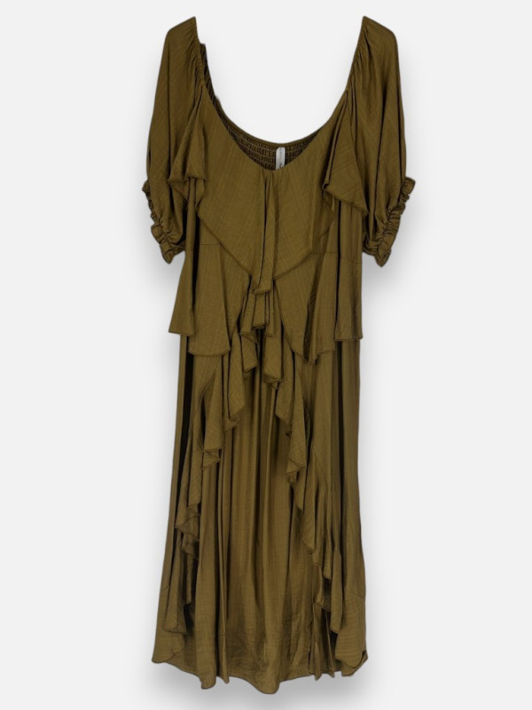 Coucou les copines ! On vous présente aujourd'hui la pépite 'Cache Cache', une robe ou tunique selon vos envies qui va vous faire fondre. Entièrement smockée sur le haut, elle épouse vos formes avec douceur sans jamais serrer, assurant un confort absolu tout au long de la journée. On adore son côté caméléon : son encolure élastique permet de la porter de façon classique ou de faire tomber le tissu sur les épaules pour un look 'bardot' super féminin et estival. C'est la pièce parfaite pour les beaux jours avec sa coupe originale qui ne nécessite aucun repassage. Que vous fassiez 1m60 ou 1m80, son tombé est impeccable. Mariez-la avec un pantalon moutarde, beige ou même du kaki pour un ensemble chic et branché. Elle convient d'une petite taille jusqu'au 48/50 sans aucun problème, une vraie merveille de polyvalence !