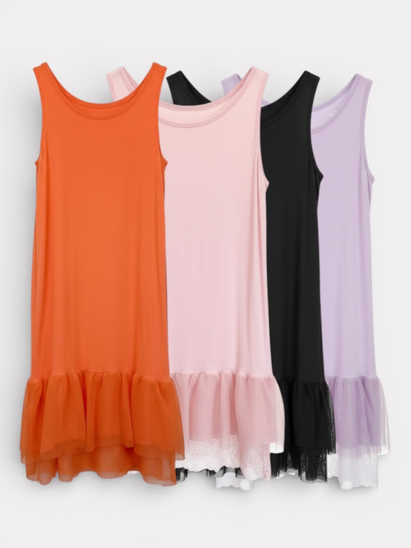 La Robe Lola est la pièce magique pour transformer vos tenues. Utilisée principalement en fond de robe ou en superposition, elle se distingue par son large volant en tulle et dentelle au bas, qui apporte du volume et de la féminité sous un pull ou une tunique. Sa matière stretch assure un confort total et épouse les formes sans comprimer. Disponible en parme, rose poudré, noir ou orange, elle permet de créer des rappels de couleurs sophistiqués. Pour les plus petites tailles, elle peut se porter seule comme une petite robe d'été légère et romantique. C’est l’investissement mode intelligent qui permet de rallonger une robe trop courte ou de donner un second souffle à vos pulls préférés en créant un look déstructuré typique de l'esprit Mona-Dress.