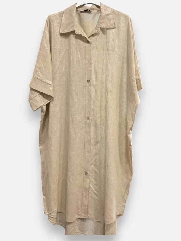 La chemise Loulou (souvent portée comme une robe courte ou tunique) est la définition même du luxe naturel. Fabriquée dans un mélange noble de 100% lin et de coton, elle présente une discrète brillance qui lui donne un aspect précieux. Vendue 55 euros, elle va jusqu'à la taille 48. Le lin apporte cette tenue et cette fraîcheur incomparable, tandis que le coton adoucit la fibre pour un confort maximal. Son coloris beige naturel est un intemporel qui se marie avec tout. Vous pouvez la porter fermée avec une ceinture pour marquer la taille, ou ouverte comme un long gilet par-dessus un maillot de bain ou un petit ensemble d'été. Elle est parfaite pour celles qui aiment les matières authentiques avec une touche de glamour. Une pièce de caractère, durable et élégante, qui sent bon les vacances et le soleil de Saint-Tropez !