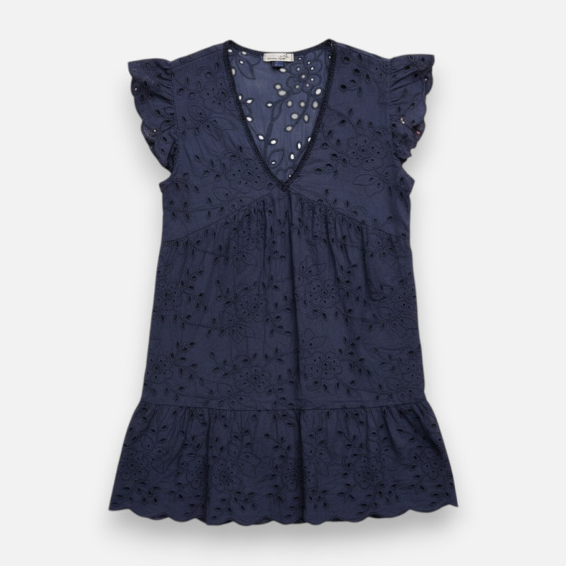 La robe Fany est un véritable bijou de fraîcheur. Confectionnée en 100% coton avec de la broderie anglaise, elle est entièrement doublée d'un voile de coton ton sur ton pour un confort et une opacité totale. Disponible en kaki et marine, elle va jusqu'à la taille 42. Son décolleté en V et ses petites manches sont d'une élégance rare. Mona et Christelle l'ont portée différemment lors du live : avec ou sans ceinture, le tombé est impeccable. C'est la robe idéale pour un événement estival ou une journée au bureau. Une matière noble, une coupe parfaite et un style indémodable pour 39€.
