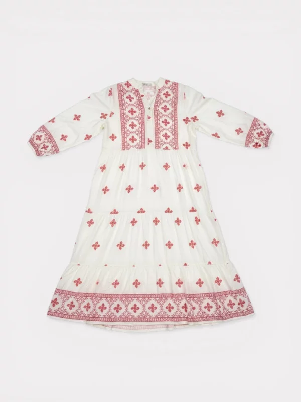 La Robe Eve est une célébration du style bohème chic chez Mona-Dress. Proposée à 29 euros, elle est entièrement réalisée dans un tissu richement brodé (ce n'est pas un imprimé, c'est de la véritable broderie !). Sa coupe ample et vaporeuse est idéale pour affronter les fortes chaleurs tout en restant d'une élégance absolue. Elle convient parfaitement aux tailles allant du 40 au 46 ; nous déconseillons de la porter en dessous de la taille 40 car son volume serait trop imposant. C'est la robe de vacances parfaite, à porter avec un grand chapeau de paille et un foulard 'Flamenco' sur les épaules. Disponible en blanc éclatant, elle capte la lumière et vous donne une allure angélique et décontractée. Un vrai bonheur à porter.