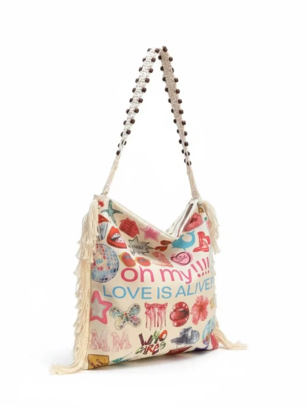 Laissez-vous charmer par le sac 'Alive', une pièce forte qui respire la joie de vivre et l'insouciance. Confectionné dans une toile de coton ultra-légère et souple, ce sac cabas se distingue par ses inscriptions graphiques et colorées évoquant le 'karma', les papillons et la mode. Le véritable atout charme de ce modèle réside dans sa bandoulière artisanale : un travail minutieux de crochet agrémenté de perles en bois naturel qui apporte une touche bohème-chic irrésistible. Pratique et spacieux, il est doté d'une fermeture éclair sécurisée pour transporter tous vos essentiels, du portefeuille à la liseuse. Que vous le portiez à l'épaule sur une petite veste en jean ou à la main pour une virée shopping, il attire tous les regards. C'est l'accessoire parfait pour celles qui aiment les pièces uniques avec une âme. Un indispensable pour vos prochaines vacances à Saint-Tropez ou ailleurs !