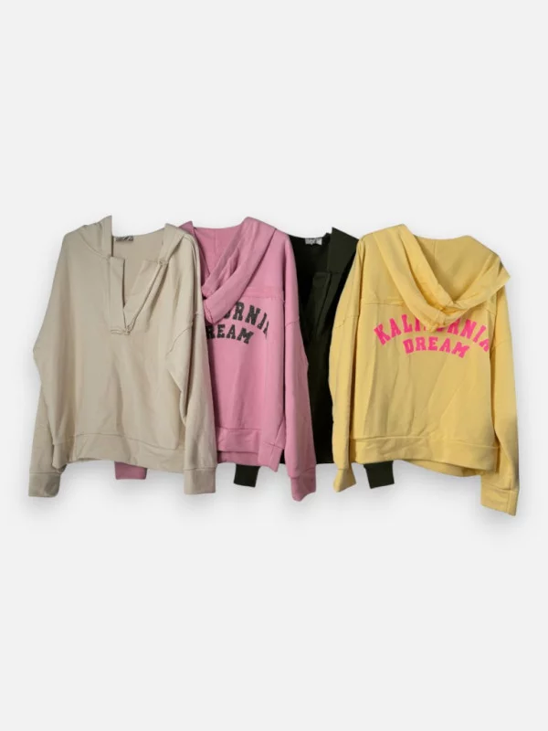 C'est la nouveauté pépite de chez Mona-Dress ! Ce sweat Raven en 100% coton italien va vite devenir votre chouchou. Sa coupe est parfaitement pensée avec une encolure en V qui dégage le port de tête, contrairement aux sweats à capuche classiques. On craque totalement pour son dos travaillé avec une inscription en paillettes scintillantes qui apporte une touche lumineuse et ultra féminine à votre allure. Comme présenté en live, vous pouvez le porter en superposition sur un petit top à dentelle pour laisser dépasser un liseré délicat aux poignets et à la taille, créant un look recherché. Disponible en kaki, rose fuchsia, blanc écru ou jaune peps, il s'adapte à toutes les carnations. C'est un produit de marque, gage de qualité supérieure, qui allie le côté doudou du sweat et le chic des détails brillants. Un indispensable pour un look décontracté mais résolument mode !