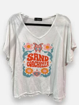 Plongez dans l'ambiance hippie-chic avec le T-Shirt Coachella Dream ! Ce haut en pur coton ultra-doux se distingue par son col en V flatteur et son imprimé magnifique : un mélange de fleurs colorées et d'un papillon central dans un style vintage années 70. Disponible en blanc, jaune, fuchsia, turquoise ou rose poudré, il apporte une dose de bonne humeur instantanée à votre garde-robe. Sa coupe confortable convient parfaitement jusqu'à la taille 46. On l'imagine porté avec notre jupe Nad en soie pour un contraste de matières réussi ou simplement avec un jean Sandro pour un look quotidien stylé. À 49 euros, c'est la pièce fraîche et colorée indispensable pour vos festivals ou vos vacances !