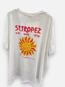 Le t-shirt Vacances est l'indispensable absolu de votre valise estivale. Avec son inscription iconique 'Vacances à Saint-Tropez' et son petit soleil jaune signature, il insuffle instantanément un air de bord de mer à votre garde-robe. Sa coupe oversize moderne, légèrement plus courte devant que derrière (environ 67 cm de longueur au dos), offre une allure décontractée et parfaitement structurée. Conçu dans un coton de haute qualité, il est extrêmement agréable à porter, même lors des journées de grande chaleur. Sa taille unique très généreuse convient à toutes les silhouettes, habillant avec aisance du 34 jusqu'au 50. Disponible en blanc pur, bleu ciel rafraîchissant ou rose poudré délicat, il se marie à merveille avec un jean mom ou un petit short en jean. C’est le t-shirt qui vous motive dès le matin et qui attire les regards par sa simplicité ensoleillée et son style branché. Un véritable must-have pour célébrer les beaux jours avec élégance.