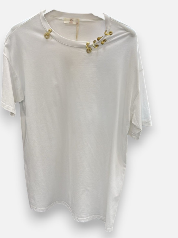 Le T-Shirt Bijoux est la pièce rebelle et stylée de la collection Monadé. Ce t-shirt en coton noir profond se distingue par ses détails 'piercings' : des anneaux métalliques argentés et des petits strass rivetés directement dans la maille, créant un effet bijou intégré unique. Sa coupe droite et légèrement oversize offre un confort moderne et un look résolument rock'n'roll. Disponible en deux tailles (SM pour le 36-38 et LXL jusqu'au 44), il s'adapte à vos envies de style : portez-le près du corps ou très loose. On adore sa longueur généreuse qui permet de couvrir les hanches. Comme présenté lors du live, ce t-shirt n'a besoin d'aucun accessoire supplémentaire tant ses détails métalliques suffisent à habiller votre buste. Idéal avec un jean slim ou une jupe en cuir, il est la preuve que le coton peut être d'une sophistication extrême. Une pièce forte pour celles qui aiment se démarquer avec élégance.