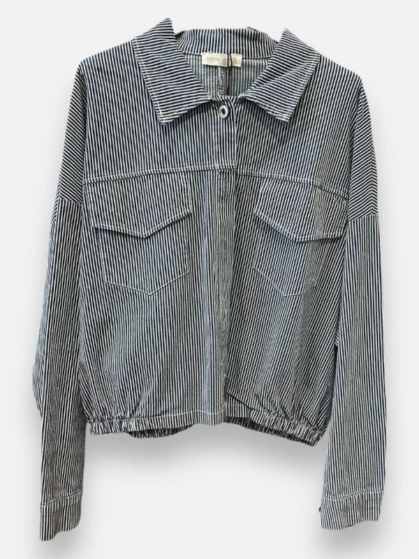 Ce blouson est la pièce hybride que vous allez adorer porter cette saison. Entre la chemise et la veste courte, il offre une coupe moderne et dynamique. Ses rayures marines sur fond blanc rappellent l'élégance du style Riviera. On aime particulièrement sa base élastiquée qui permet de le blouser joliment à la taille, créant une silhouette féminine et structurée. Il dispose de poches sur la poitrine qui renforcent son côté 'workwear' chic. Sa matière en coton fin est idéale pour les températures douces du printemps. Vous pouvez le porter fermé comme une chemise ou ouvert sur un petit top en version petite veste d'appoint. Il s'accorde divinement bien avec le pantalon rayures pour un total look audacieux, ou sur une robe unie pour calmer le jeu. Une pièce versatile qui va booster votre style quotidien !