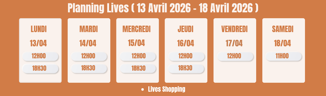 Chez Mona Dress, nous faisons des lives shopping du lundi au samedi. Les horaires des lives sont indiqués sur notre site.